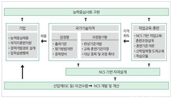 우리나라 자격체계와 NCS의 관계 -시앤피컨설팅 책임컨설턴트 서정하- 전 산업에 걸친 국가직무능력표준(National Competency Standards, 이하 ‘NCS’)의 개발됨에 따라 NCS는 산업현장, 교육훈련, 자격 등 다양한 인적자원 개발의 분야에 활용되고 있다. 이에 본 글에서는 현재 우리나라 자격체계에서의 NCS 활용 현황 및 관계를 분석하고 이를 토대로 향후 우리나라 자격체계의 발전을 위해 더 나은 NCS의 활용 방향을 제시하고자 한다. 1부 : 우리나라의 자격체계와 NCS의 관계 2부 : 국가기술자격에서의 NCS 활용 3부 : 민간자격에서의 NCS 활용 4부 : 4차 산업혁명시대의 자격과 NCS 자격의 의의 3차 산업혁명을 기반으로 디지털과 바이오 산업, 물리학 등 3개 분야의 융합된 기술들이 경제체제와 사회구조를 급격히 변화시키는 기술혁명인 4차 산업혁명이 도래하고, 인적자원의 양적공급의 둔화, 노동시장의 유동성 증가 등 노동 및 직업에 대한 배경과 가치관이 변화함에 따라 인적자원개발의 중요시 되고 있다. 이와 더불어 인적자원개발, 학위 등의 지식 축적의 결과를 외부적으로 나타낼 수 있는 자격의 중요성 또한 증대되고 있다. 자격의 기능 이러한 자격은 다양한 기능들을 가지고 있는 기본적으로 노동시장에서 구직자가 가지고 있는 능력을 보여주는 신호(signal)의 기능, 기업이 구직자가 보유한 능력을 판단할 수 있는 선별(screening)의 기능, 노동시장의 니즈를 반영하여 교육훈련 등 능력개발을 선도(guide)하는 기능, 자격소지의 능력을 보장 및 우대하거나 자격 미소지자의 진입을 통제하는 면허(licence)의 기능 등을 가지고 있다. 자격의 유형 또한, 자격은 기능별, 내용별, 시행주체별로 다양하게 분류될 수 있는데, 기능별 분류는 자격 보유 여부에 따라 업무 수행에 제한을 주는 면허성의 업무독점형 자격과 보유한 지식 및 능력을 인정해주는 자격으로 구분되며, 내용별 분류는 자격에서 다루는 내용이 특정 직종을 대상으로 하는지에 따라 전문자격과 일반자격으로 분류된다. 마지막으로 자격의 시행주체에 따라 국가가 관리·운영하는 국가자격과 국가 외의 단체 또는 개인이 관리·운영하는 민간자격으로 분류할 수 있으며 우리나라는 국가와 민간이 이원적으로 관리·운영하고 있다. 자격의 정의 우리나라 자격은 크게 자격기본법에 의한 자격과 그 외의 법률에 의한 자격의 개념으로 나뉘는데, 자격기본법 제2조([개정 2013.4.5.])에 따르면 “직무수행에 필요한 지식, 기술, 소양 등의 습득정도를 일정한 기준과 절차에 따라 평가 또는 인정된 것을 말한다.”로 정의되어 소위 자격증, 면허증 등과 같은 직업적인 측면에서의 자격을 의미하지만, 타 법률에서는 일정한 요건·조건·기준을 의미하는 등 보다 폭넓게 활용하고 있다. 국가가 법률에 따라 관리·운영하는 국가자격은 각 개별법령에 의한 국가(전문)자격(예, 변리사, 약사, 회계사 등)과 국가기술자격법에 의한 국가기술자격(주로 기술·기능 및 서비스 분야로 구성)으로 구분되며, 국가 외 개인, 법인, 단체가 관리·운영하는 민간자격은 자격 등록관리 기관인 한국직업능력개발원(이하 ‘직능원’)에 등록 후 운영하며, 이중 국가의 공인을 받은 국가공인 민간자격과 공인을 받지 못한 순수 민간자격으로 구분된다. 각 자격의 유형에 따른 특징 및 운영방법에 대해서는 2부, 3부에서 자세히 다루도록 한다. 자격의 인정 우리나라는 국가 또는 민간으로 인정주체가 달라질 수는 있지만 자격을 인정하는 방법은 통상적으로 네 가지 방법을 통하여 인정(accreditation)된다. 첫째로, 자격을 운영·관리하는 기관에 의해 별도의 필기 또는 실기 자격시험을 치루고 합격기준을 충족한 합격자에게 관련 자격증을 부여하는 형태로 검정형 자격으로 우리나라는 530개 종목(2019년 기준)을 운영하고 있다. 둘째로, 일정한 교육훈련과정을 이수하면 자격을 인정하는 방법으로, 이러한 이수자격이 제 기능을 발휘하기 위해서는 교육훈련과정을 통해 요구되는 능력과 자질을 충분히 갖출 수 있다고 신뢰할 수 있는 과정이 전제되어야 하며, 지속적이고 엄격한 질 관리가 이루어져야 한다. 우리나라는 이러한 이수형태의 자격인 ‘과정평가형 자격’을 2015년부터 도입하여 운영하고 있으며 2019년에는 143종목까지 확대할 예정이다. 셋째로, 일 또는 현장경력을 통해서 인정될 수 있는데, 현장경력이나 작업경험을 일정하게 평가하여 자격기준에 부합하는 직무능력이 인증된다면 해당 자격을 부여하는 방법이다. 이에 우리나라는 근로자의 경력을 우대하고 중복학습 및 불필요한 시간·비용 투자를 방지하며, 자격의 높은 현장성을 확보하기 위해 ‘현장경력인정형 자격’을 도입하고자 시범사업을 추진하고 있다. 넷째로, 비공식적 교육훈련 등 선행학습 과정을 통해서 인정된다. 이전에 이루어진 비공식적(nonformal), 무형식적(informal) 교육훈련, 즉 넓은 의미의 선행학습(prior learning)을 인정하여 상응하는 자격을 부여하는 것이다. 현장에서의 교육훈련 경험 등이 주로 반영되는 것이기에 위의 일 또는 현장경력 인정자격과 연계된 형태가 많다. NCS의 도입 자격은 기본적으로 노동시장, 교육훈련